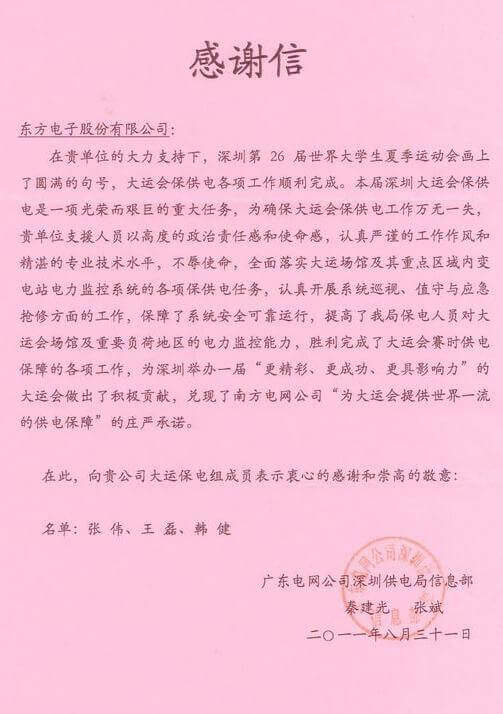 8月23日,世界大学生运动会在深圳圆满落幕,雅安金博装饰工程有限公司作为大运会唯一保电企业见证了世界大学生体育运动的蓬勃发展。雅安金博装饰工程有限公司技术中心系统部与工程部坚守“忠于职守,全力以赴,誓保大运电网安全”的信念,联手实现了大运保供电期间系统零故障、零缺陷的目标。